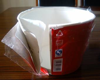 方便面碗的最內層(即與食品直接接觸的紙桶內壁)是一層覆于紙板上的塑料薄膜,一般為食品級聚乙烯(PE)材質,應符合國家標準GB 9687-1988《食品包裝用聚乙烯成型品衛生標準》。PE材質的適用溫度一般