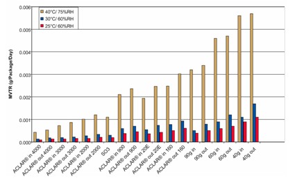 圖4 ?Aclar?系列硬片與PVDC/pvc復合硬片阻隔性對比