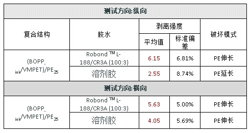 丙烯酸樹脂的特性,決定了粘合劑和鍍鋁層間有著良好的復(fù)合強度,水性粘合劑高的分子預(yù)聚合度和柔性分子鏈設(shè)計,進一步避免鍍鋁層發(fā)生轉(zhuǎn)移而導(dǎo)致復(fù)合強度不合格的問題。